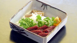 地元の猟師から直接仕入れており、鹿刺し、猪鍋は当館の人気メニューです。猪肉のとうばん鍋、とうばん焼きは、山菜類との相性が最高です。